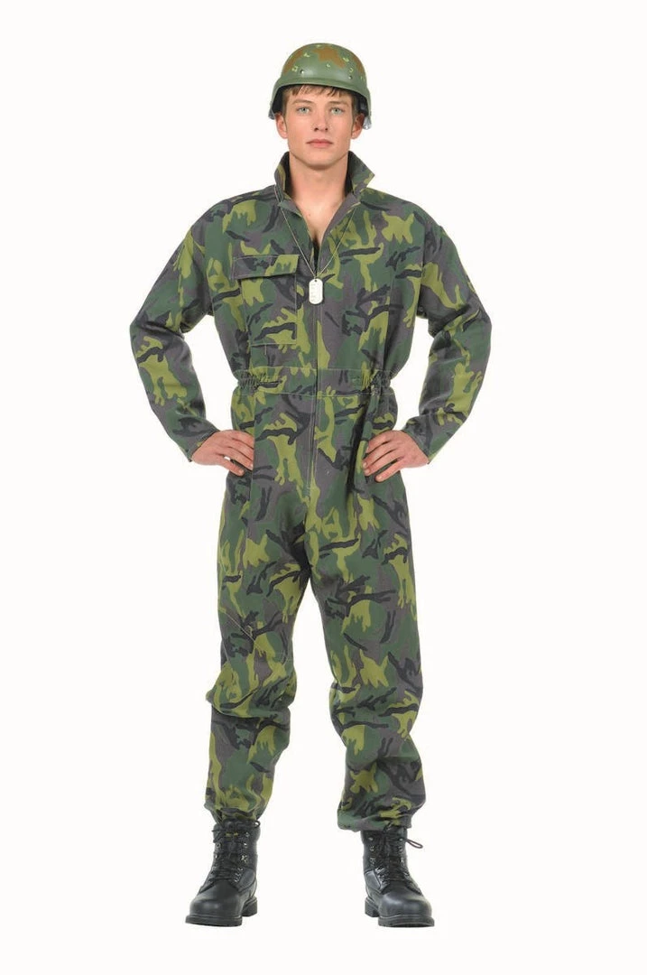 Camouflage Costume Includes Long Sleeve Camoflauge Jumpsuit with Pockets, Zipper Front Closure and Helmet. Dog Tags Not Included. Teen Size