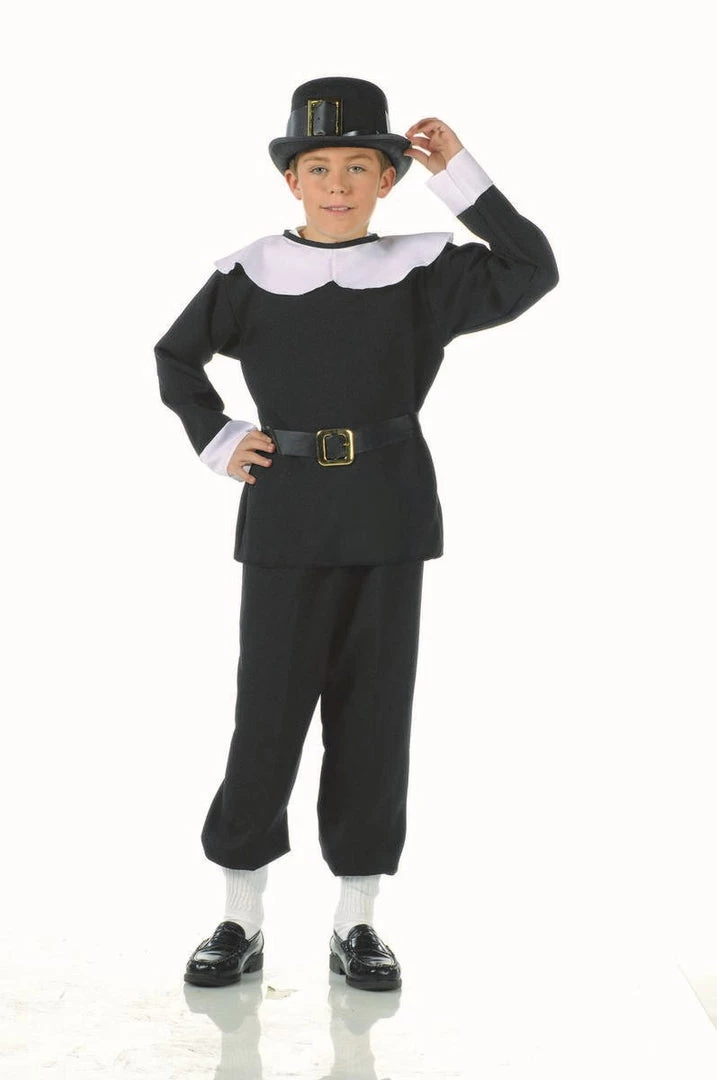 Costume Includes Black Long Sleeved Shirt with Attached White Collar and Cuffs, Black Belt and Black Pants with Elastic Waistband. *Hat not included.