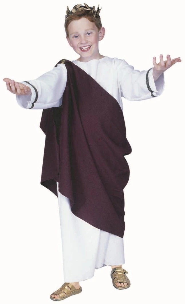 Costume Includes Long Sleeved White Toga Tunic with Attached Burgundy Shoulder Drape.Crown Not Included.