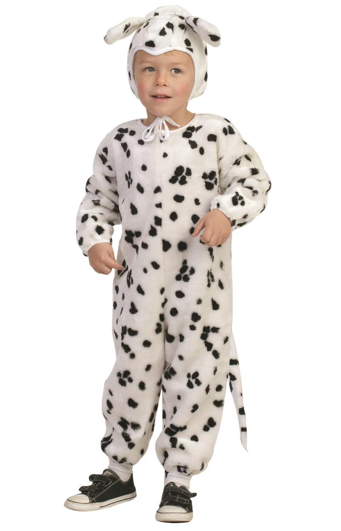 Child’s Dlamation Dog Costume Includes Long Sleeve White Plush Jumpsuit with Black Spots and Matching Hood with Ears.
