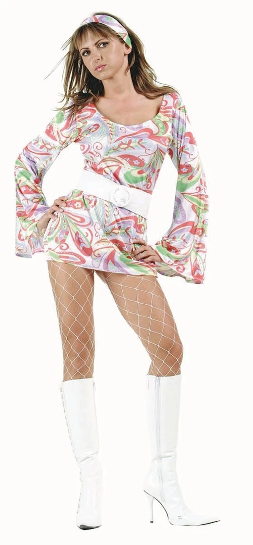 Costume Includes Colorful Mini Dress with Long Bell Sleeves and Matching Headband. *Belt and Stockings Not Included.