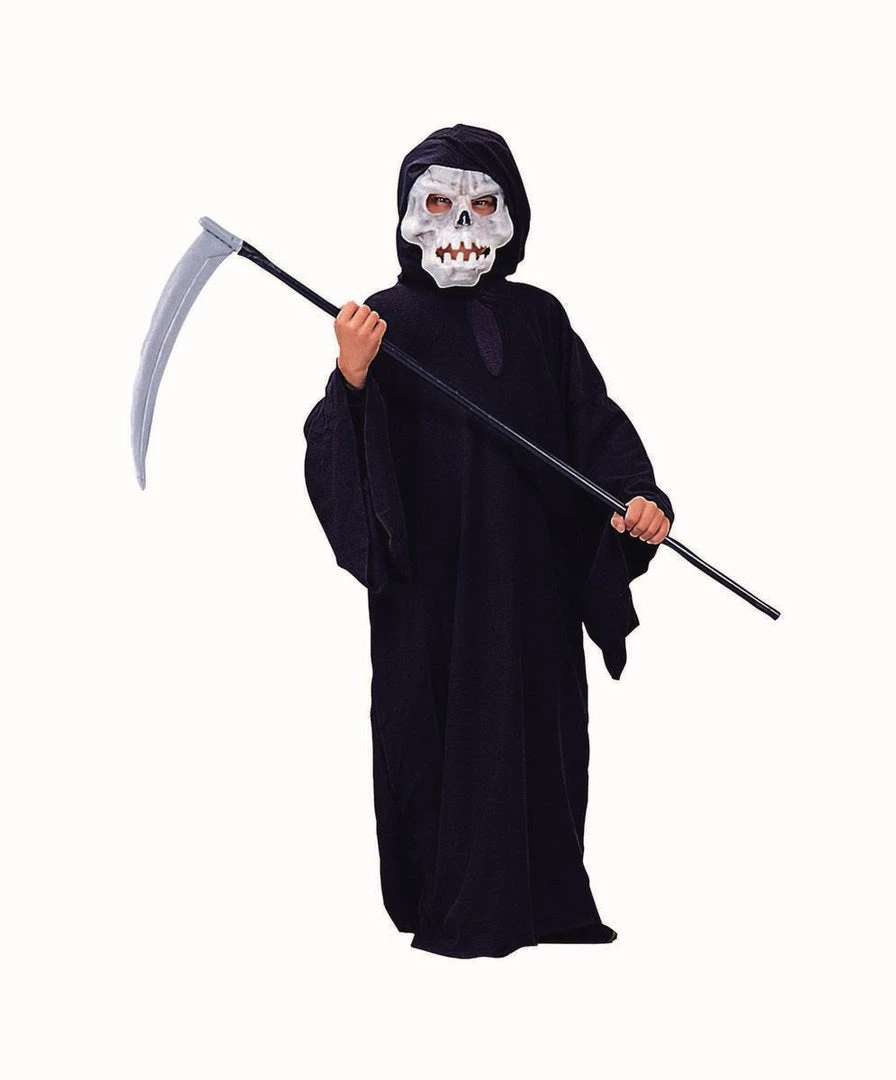 Children’s Halloween Costume Includes Long Sleeved Black Hooded Robe Only. *Latex Mask and Sickle Not Included.