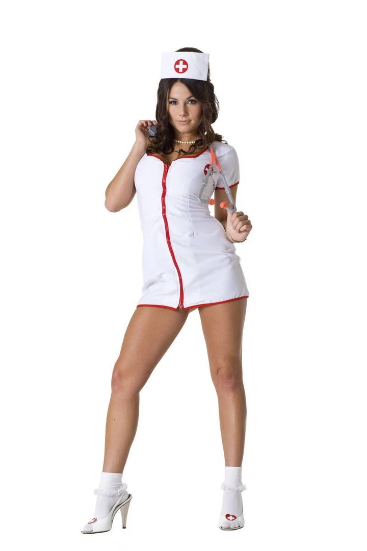 White Dress with Red Detail and Double Zip Front and Nurses Cap.Â