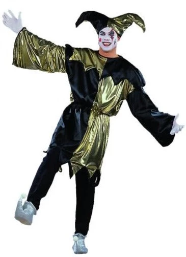 Costume includes Jester Jumpsuit, belt and hat. Available in silver/black or gold/black (pictured).