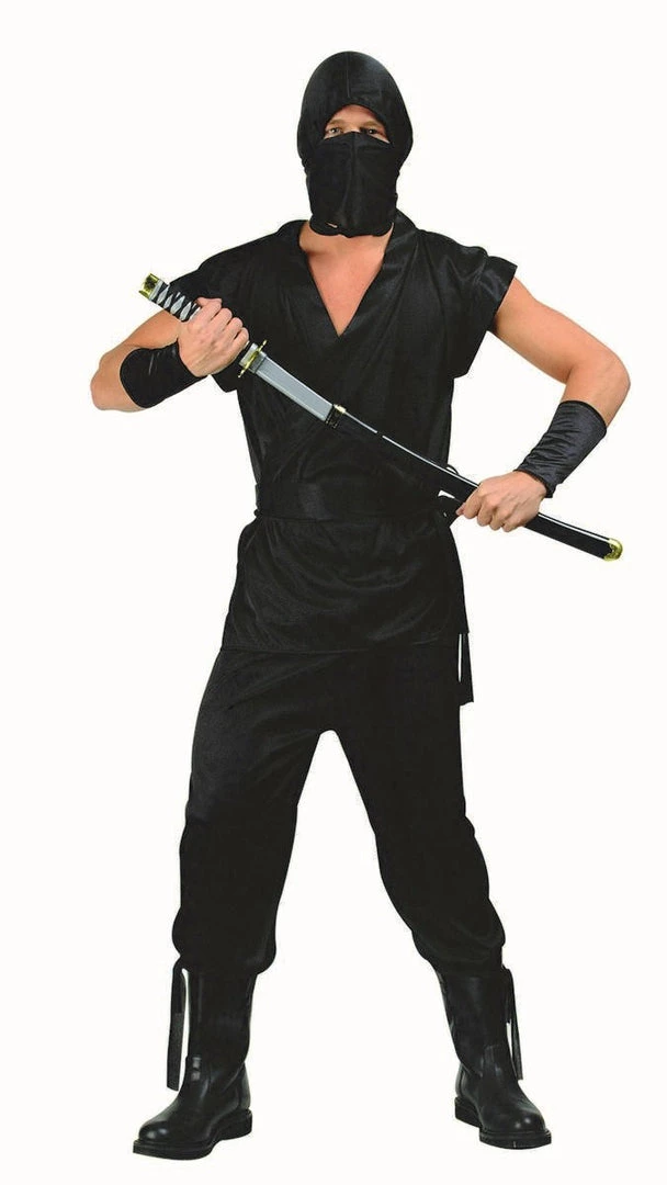 Costume Includes Black Sleeveless Shirt, Pants, Wasite Sash, Hood & Face Scarf. Sword and Wrist Cuffs Not Included.