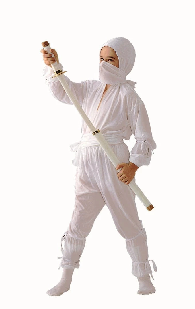 Costume Includes White Long Sleeve Shirt with Hood, White Pants, White Waist Sash and Face Scarf. Sword Not Included.