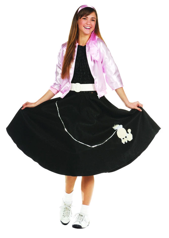 Poodle Skirt and Scarf. Top Blouse not included. Available in Red, Pink, Black, Blue and Purple.