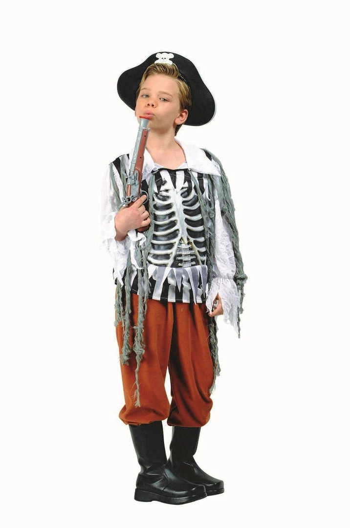 Childrens Costume Includes White Long Sleeves Shirt with 3-D Chest Bones, Brown Pants and Black Hat with Skull & Cross bones. *Gun Not Included.