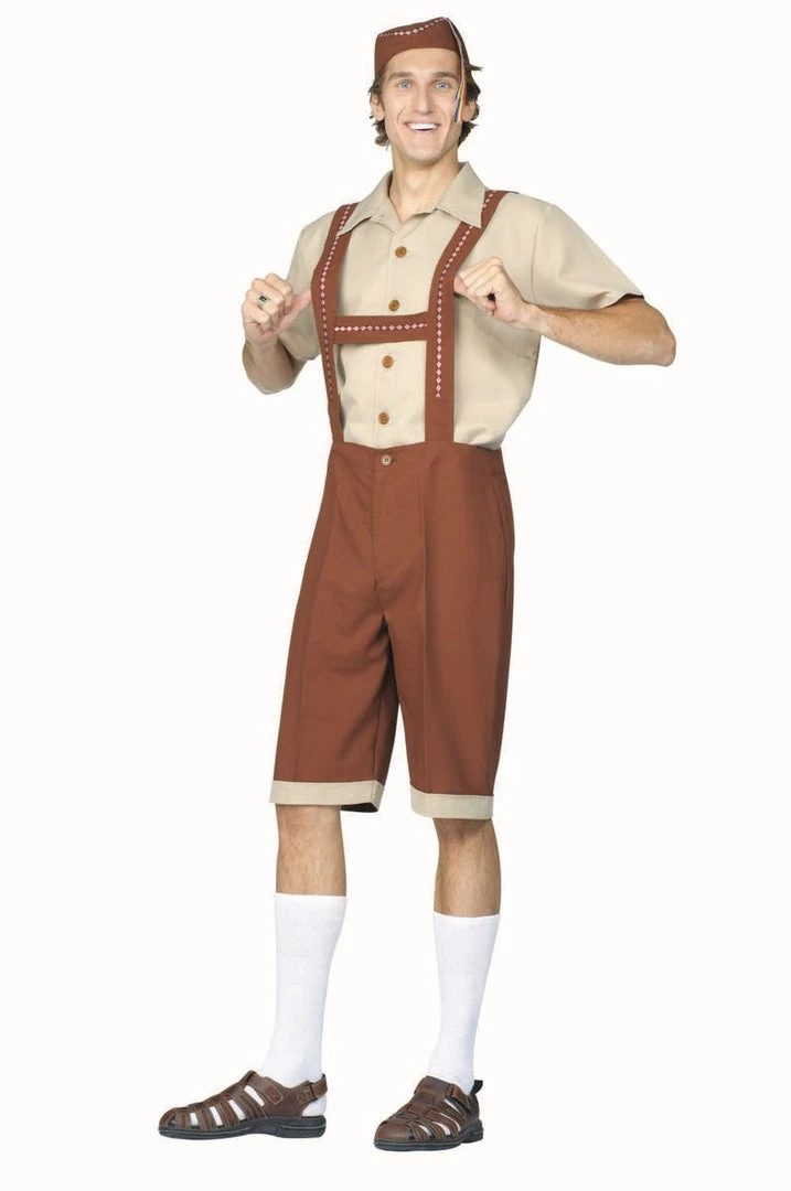 Oktoberfest Lederhosen Costume Includes Tan Short Sleeve Button Down Shirt, Brown Shorts with Attached Suspenders with Stiching Detail and Matching Hat.