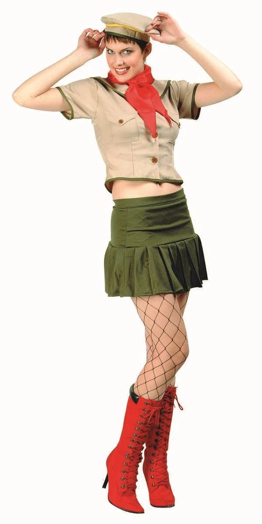 Short Sleeved Tan Shirt with Green Trim and Front Button Closures, Neck Scarf, Green Pleated Skirt and Matching Tan Hat. *Stockings Not Included.