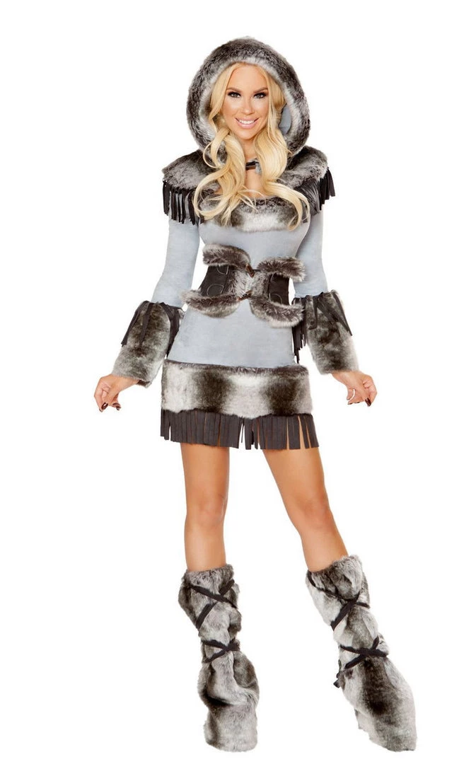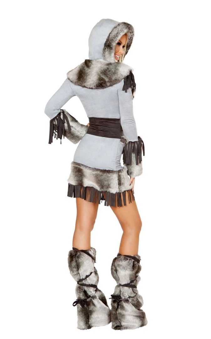 Eskimo Cutie Includes Dress with Fringe & Faux Fur Detail, Waist Cincher & Hoodie with Fringe Detail. Leg Warmers not included.
