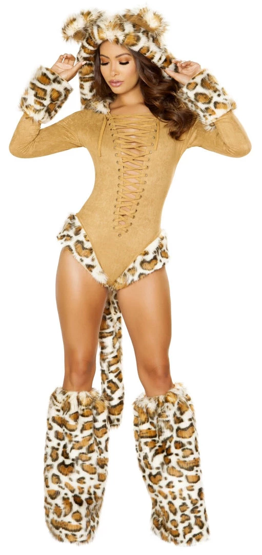 Leopard Princess includes Hooded Romper with Faux Fur Detail, Tail, & Eyelet Lace-Up.