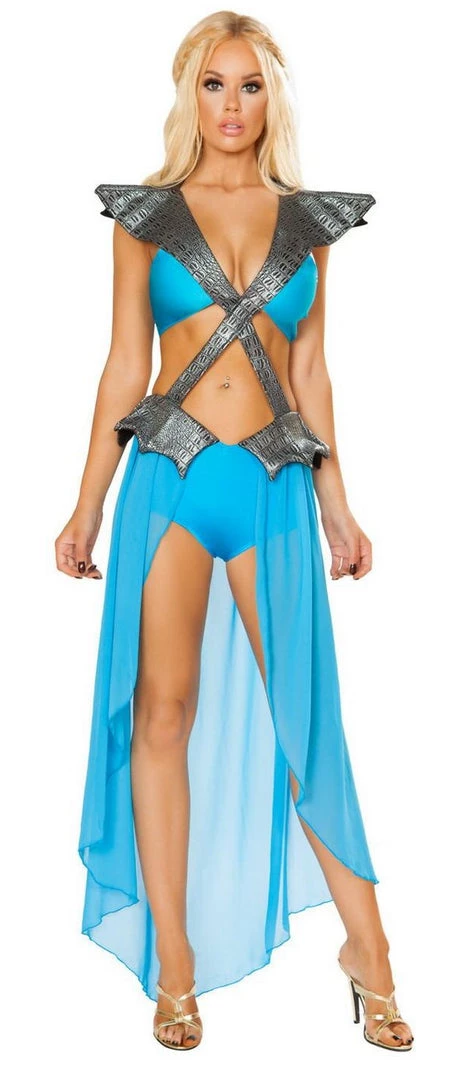 Mother of Dragons Costume includes shorts with Shear Overlay Attached Dragon Style Criss-Cross Top with Zip-up Back