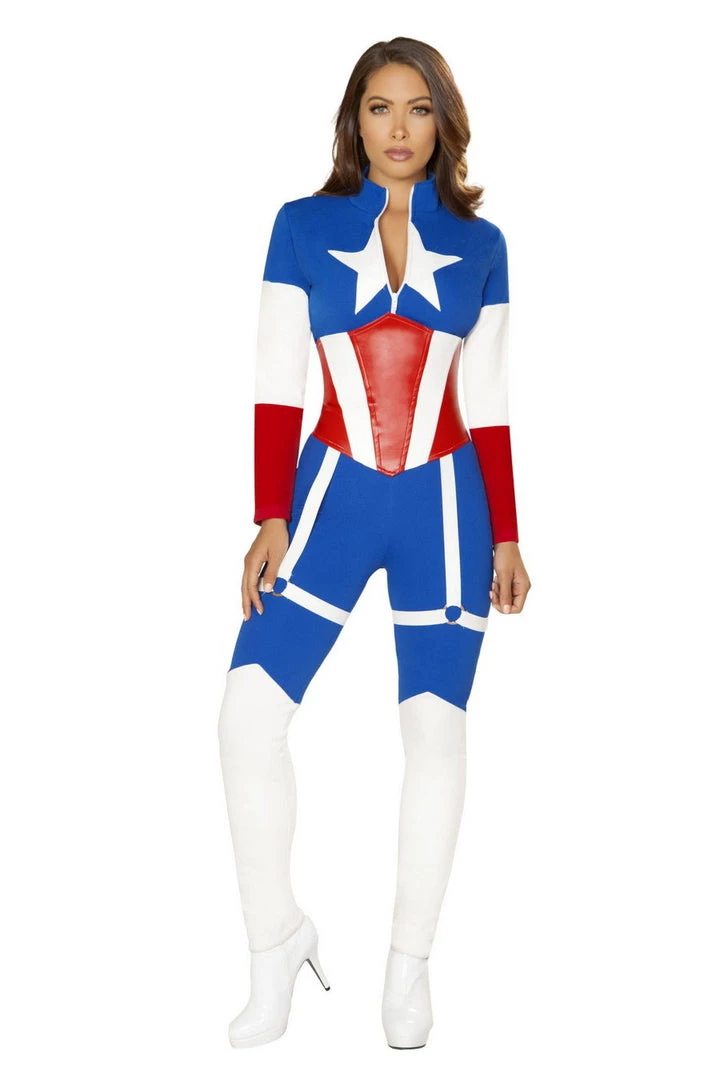 American Commander Includes Multi-Tone Catsuit with Star Detail & Zipper Closure, and Lace-Up Waist Cincher with Attached Garter.