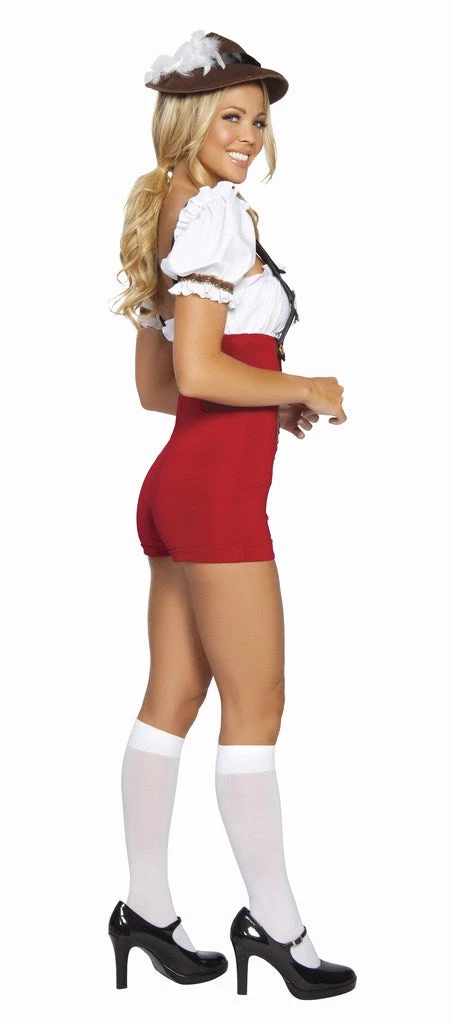 Sexy German Oktoberfest Lederhosen 4 Piece Costume Includes Red Lederhosen Hi Rise Romper, White Short Sleeved Peasant Top with Flowers Applique, Detached Puff Sleeves and Brown Hat with Feather and Flower.