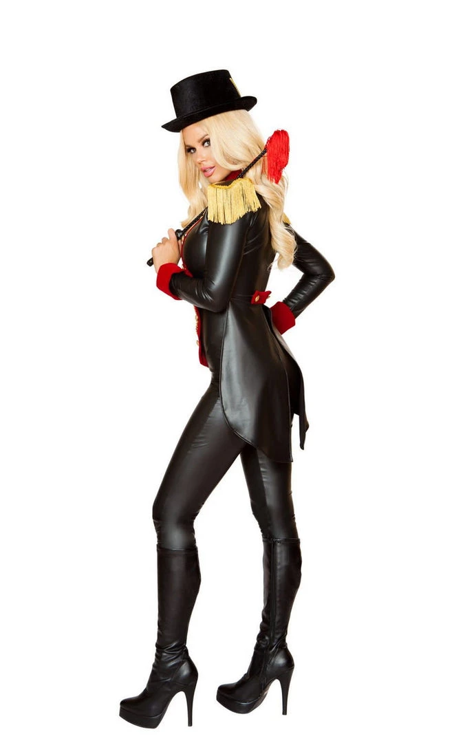 Sassy Ringleader ringmaster costume includes Catsuit with Button & Chain Detail & Attached Shoulder Pad with Fringe & Top Hat.Â