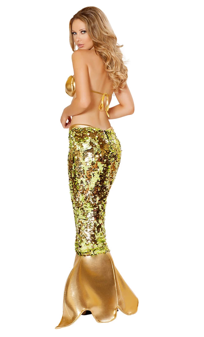Sexy Mermaid Sea Siren Costume includes Bra Top & Sequin Mermaid Skirt with front slit.