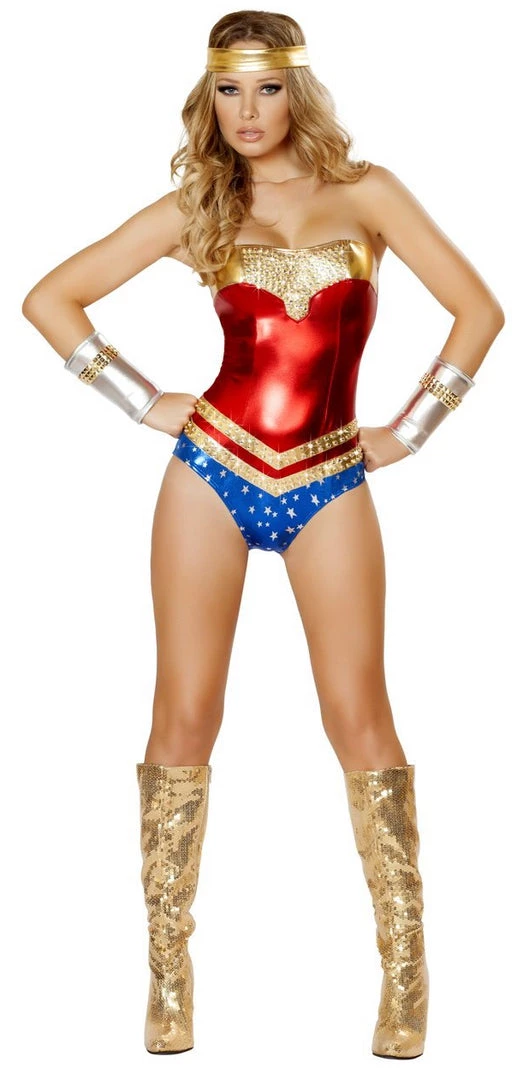 Superhero Hottie Costume Includes Romper with Rhinestone Detail, and Headband. Wrist Cuffs not included.